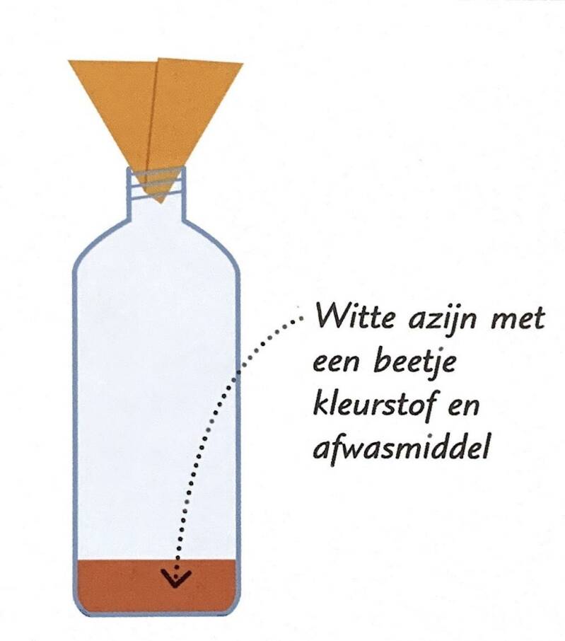 Doe 60 ml azijn in een lege plastic fles. Doe daar een paar druppels kleurstof voor levensmiddelen bij en 10 druppels afwasmiddel. Maak een trechter van een blad papier (zie afbeelding)