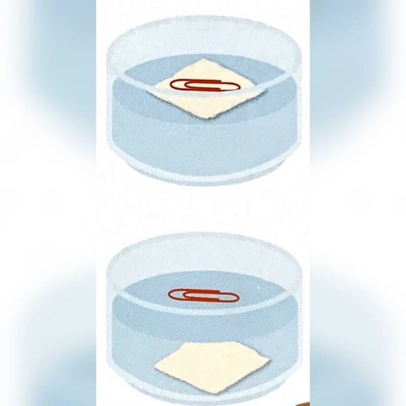 Het papier zuigt water op en zal na verloop van tijd zinken, maar door de oppervlaktespanning van het water blijft de paperclip drijven.